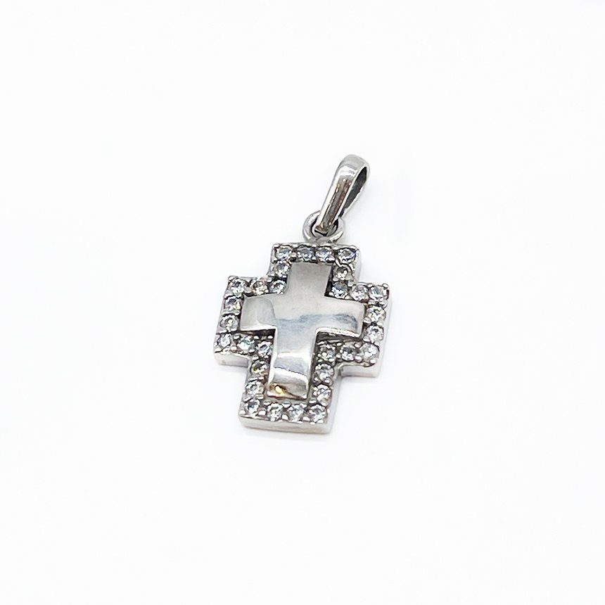 Dije Cruz París en oro blanco 18K con circones. Joya espiritual y elegante para cualquier ocasión.